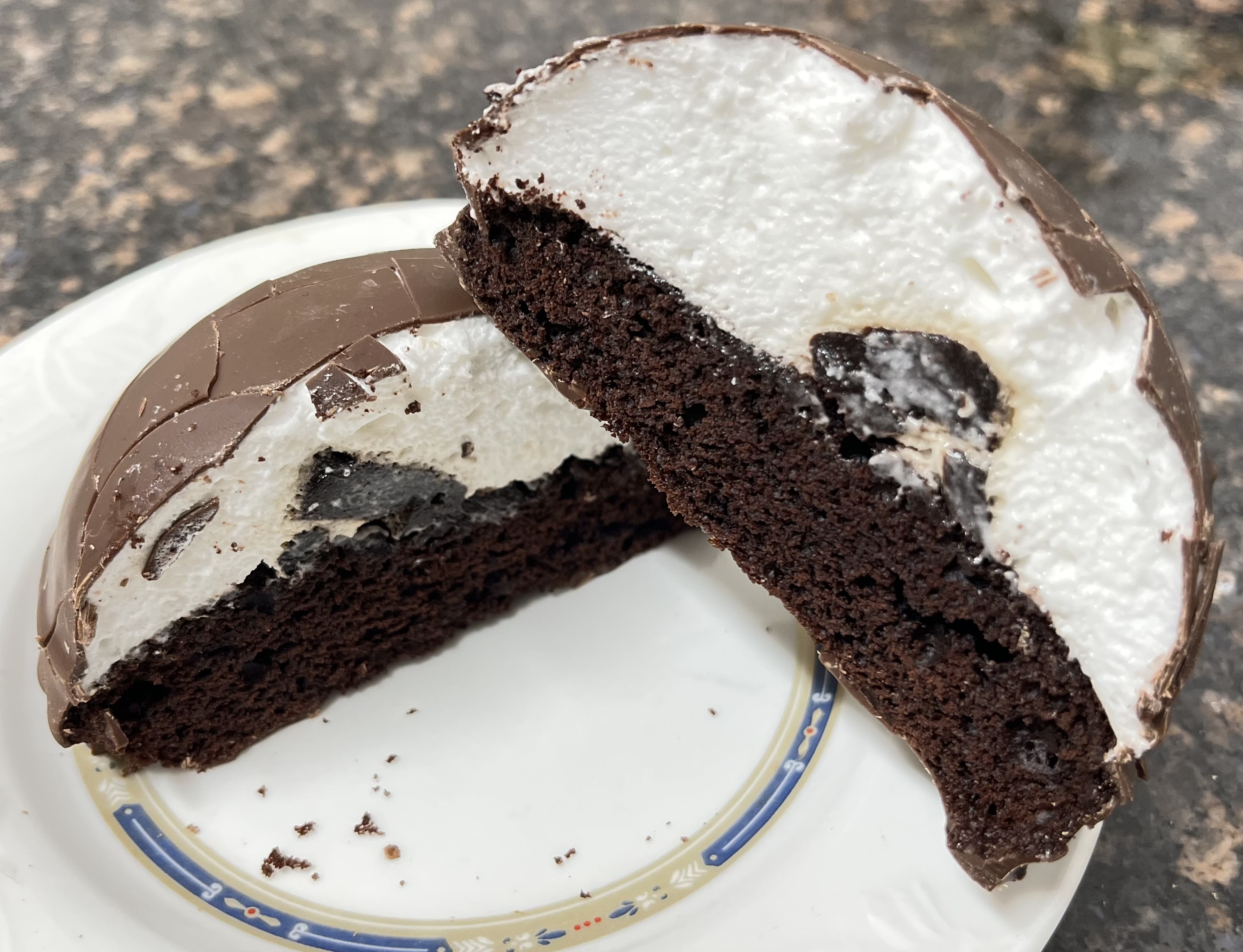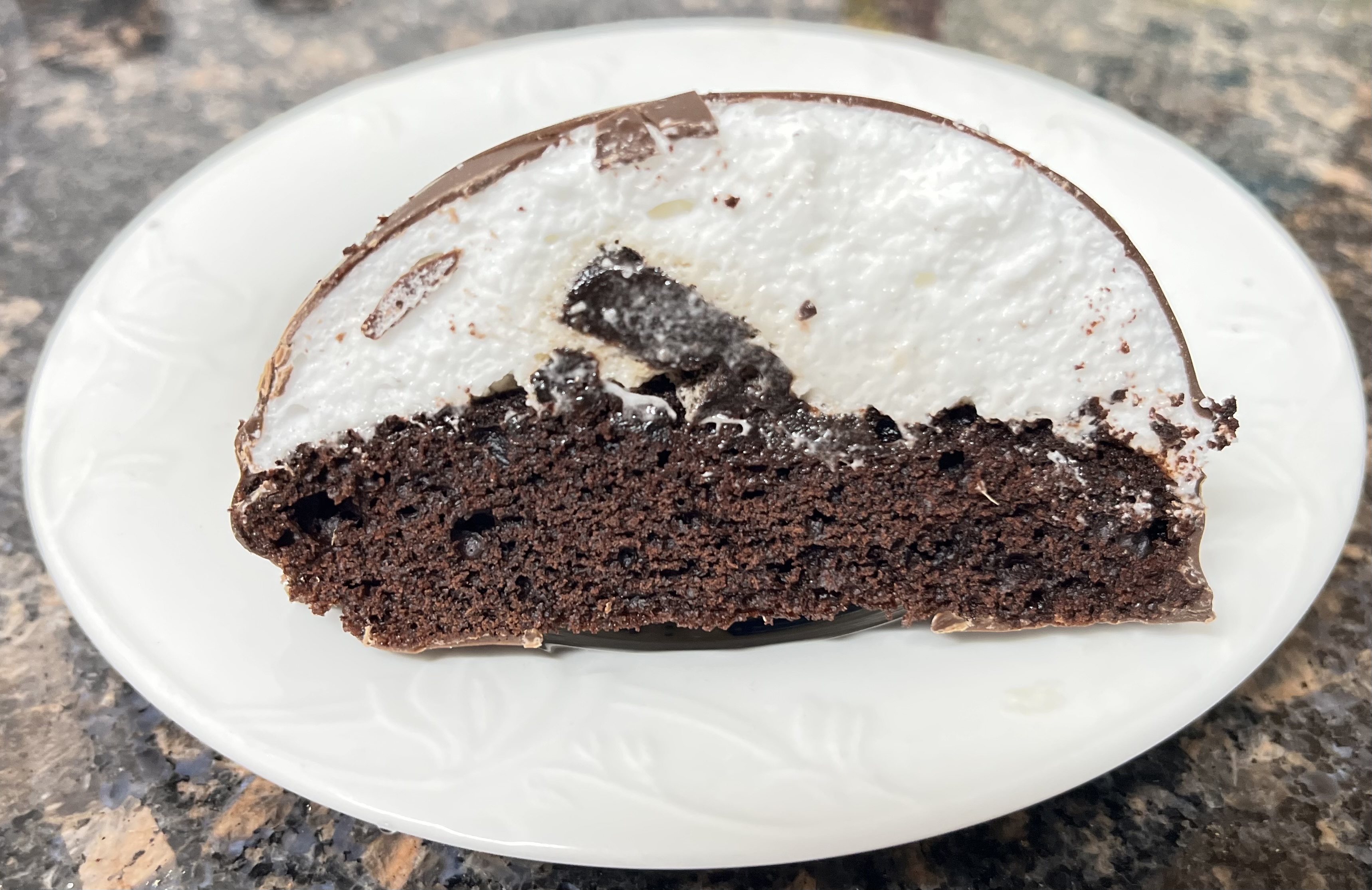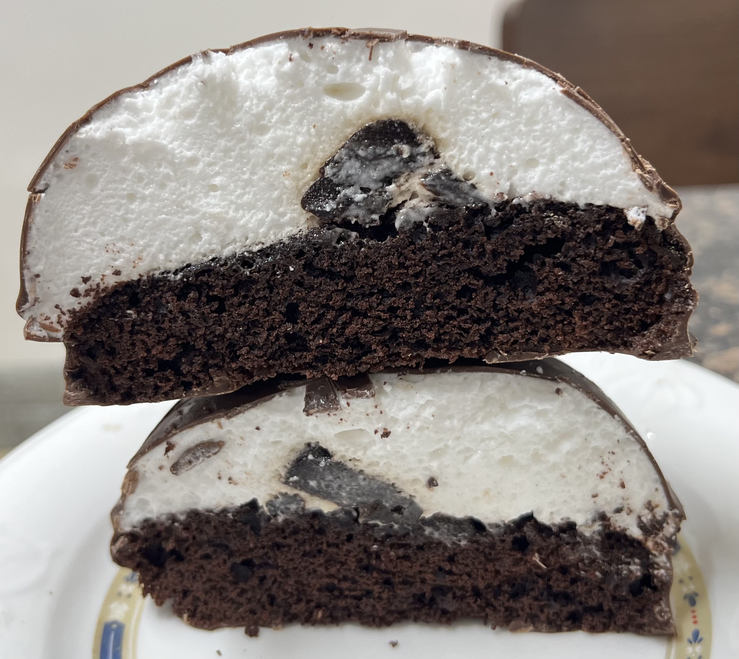 - 한입 베어문 단면 : 초코 케이크층 + 흰 크림 + 초코크림 덩어리까지 층이 확실함